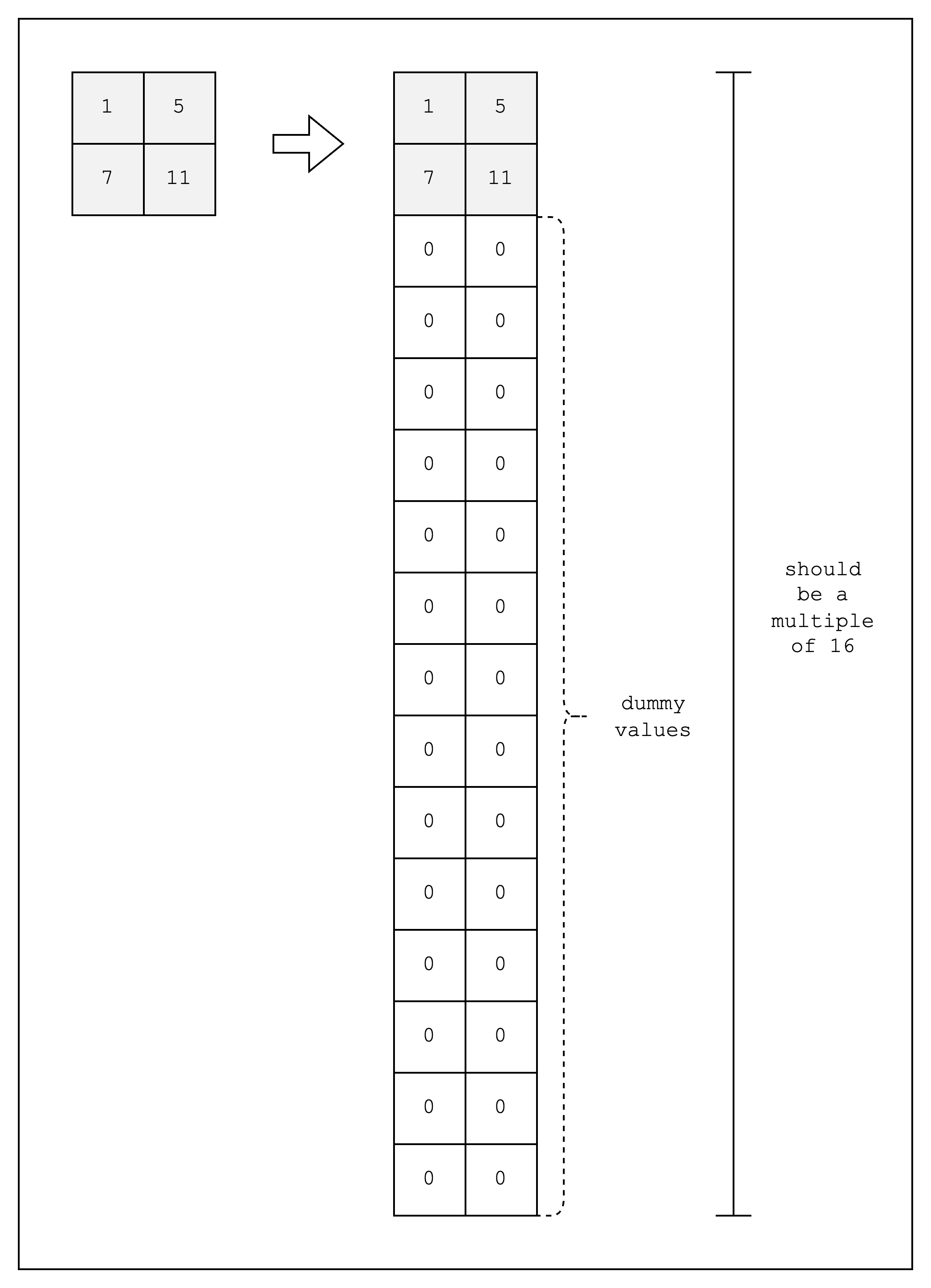 num_rows of our table as N_LANES=16 to accommodate SIMD operations. Then we create a BaseColumn of N_LANES=16 rows for each column and populate the first two rows with our values and the rest with dummy values.