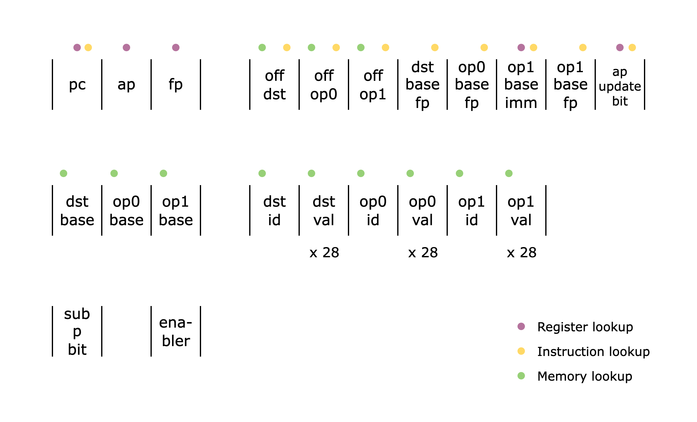 Above is the list of all the columns used in the AddOpcode component. Note that the dst_val, op0_val, and op1_val columns are actually 28 columns each (to support 28 9-bit limbs), but we show them as single columns for brevity.